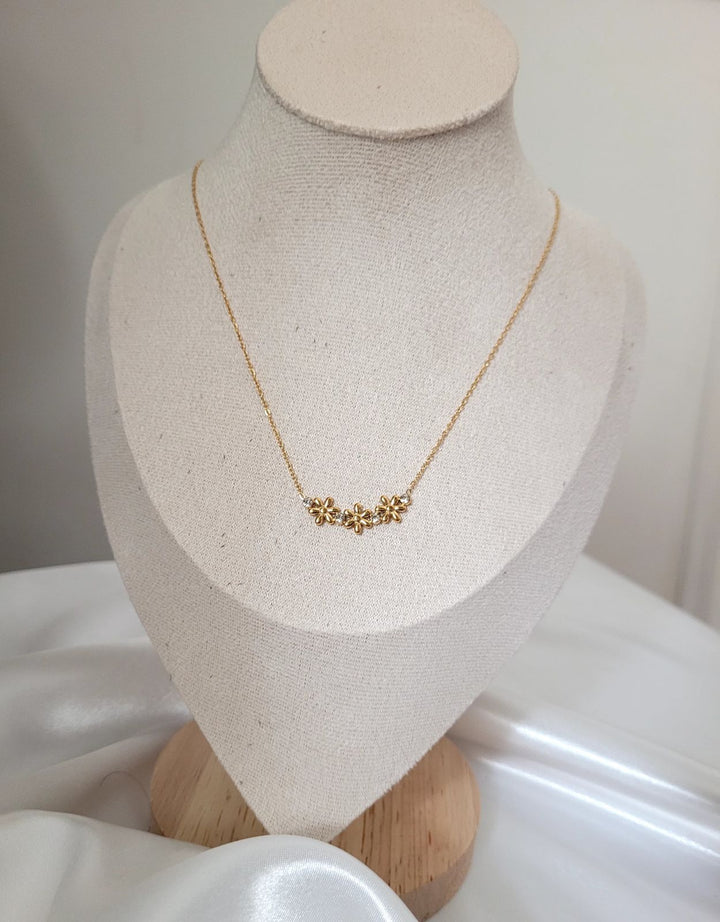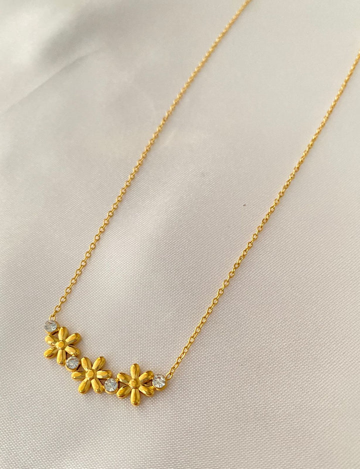 Embrace the beauty of nature with the Blossom Daze Necklace, a stunning piece designed with delicate daisy motifs and sparkling stone accents. Crafted with an 18K gold plated finish, this necklace radiates elegance and timeless charm, making it the perfect accessory for both everyday wear and special occasions.