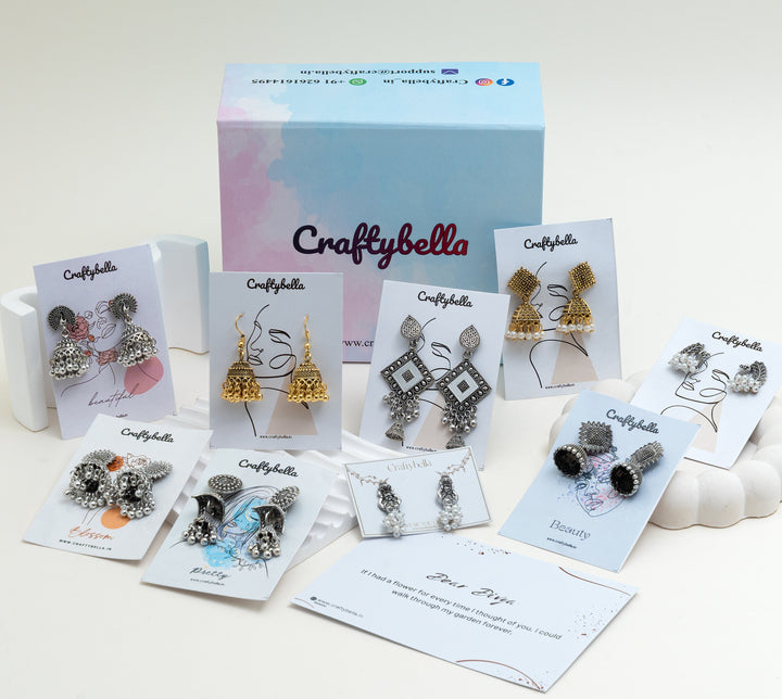 This elegant set includes 9 exquisite oxidised jhumkas, each symbolizing a different shade of love and togetherness. Whether it’s her birthday, your anniversary, or just a surprise “I love you,” this box is the perfect way to express your affection.