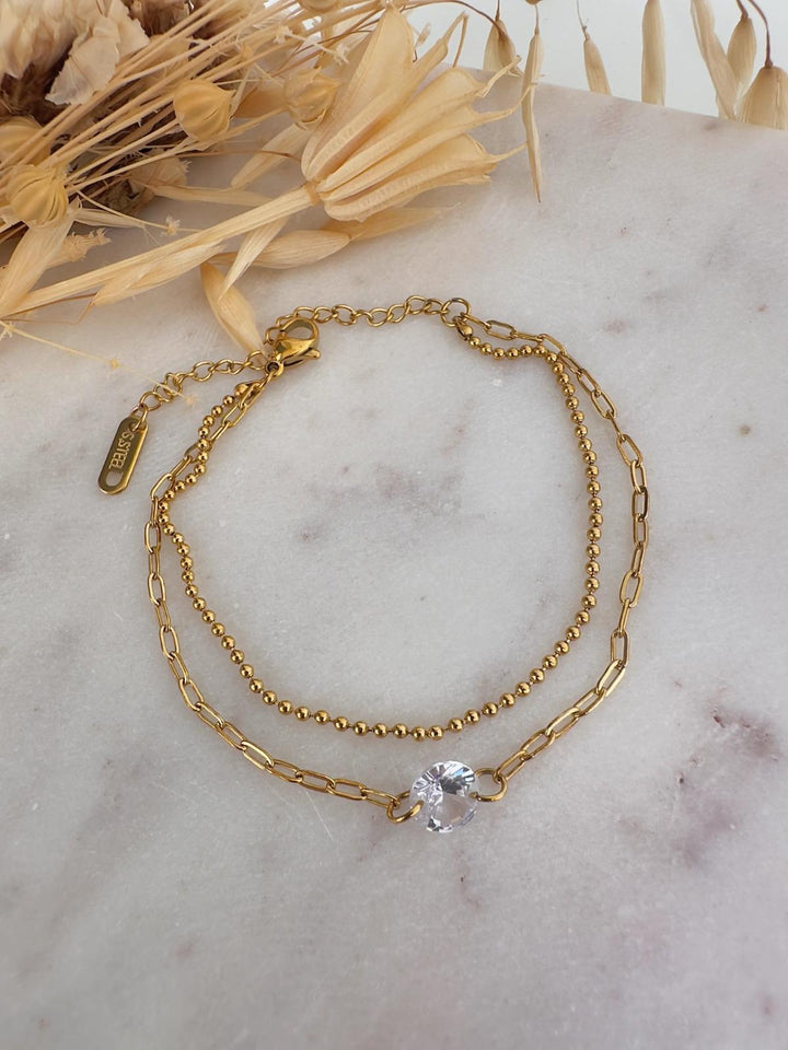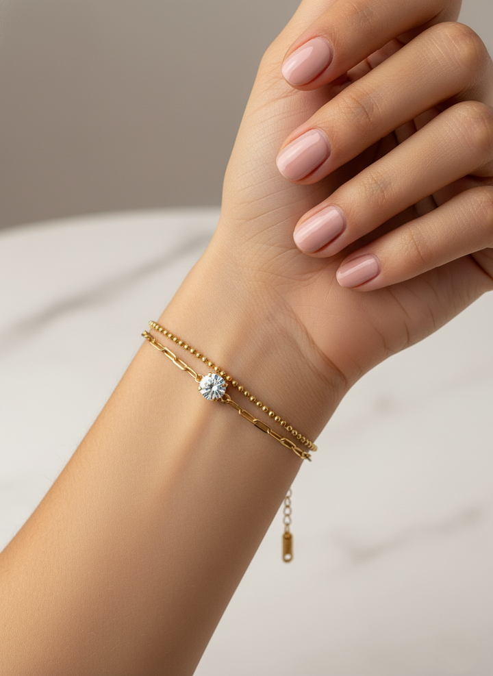 The Dainty Radiance Bracelet is a perfect blend of minimalism and luxury. Designed with a chic dual-layer look—one beaded strand and one sleek link chain—it features a brilliant solitaire-style charm that adds a soft yet stunning sparkle to your wrist.