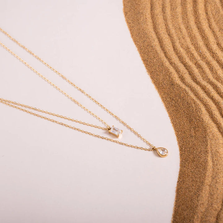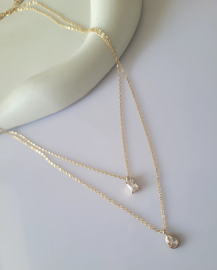 Add a touch of timeless sophistication with our Dual Charm Elegance Necklace. Designed with a sleek gold-plated chain, it features two stunning pendants – a delicate teardrop crystal and a chic square-cut stone. The layered design makes it versatile for both casual outings and special occasions, giving you a refined yet modern look.