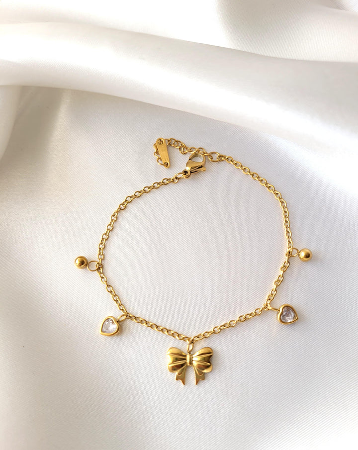 A dreamy blend of elegance and playfulness—this bracelet is designed to flutter hearts. Featuring a dainty butterfly charm at the center, flanked by crystal-studded hearts and glossy gold beads, this piece adds a subtle glow to your wrist.