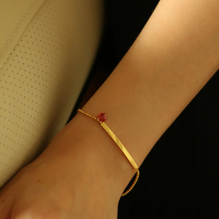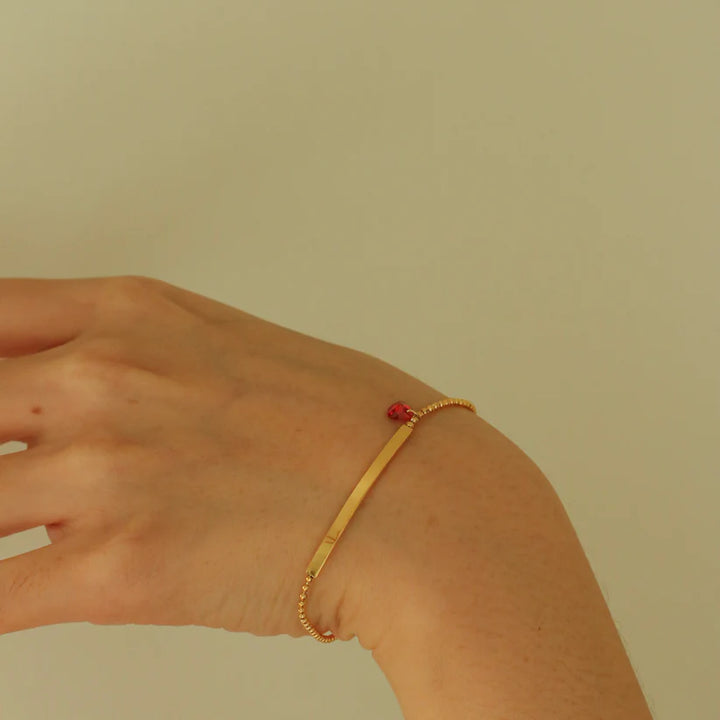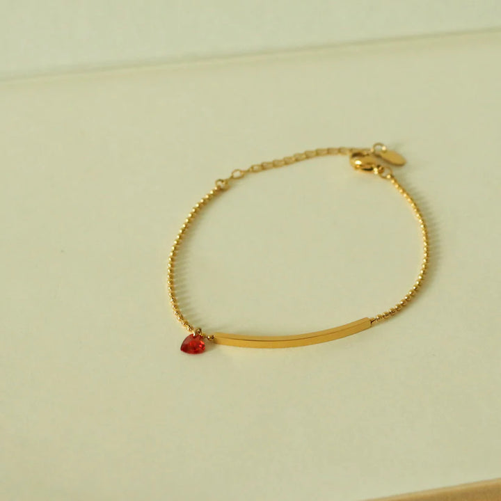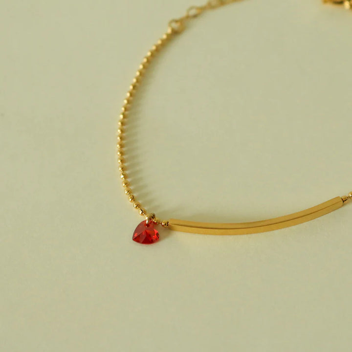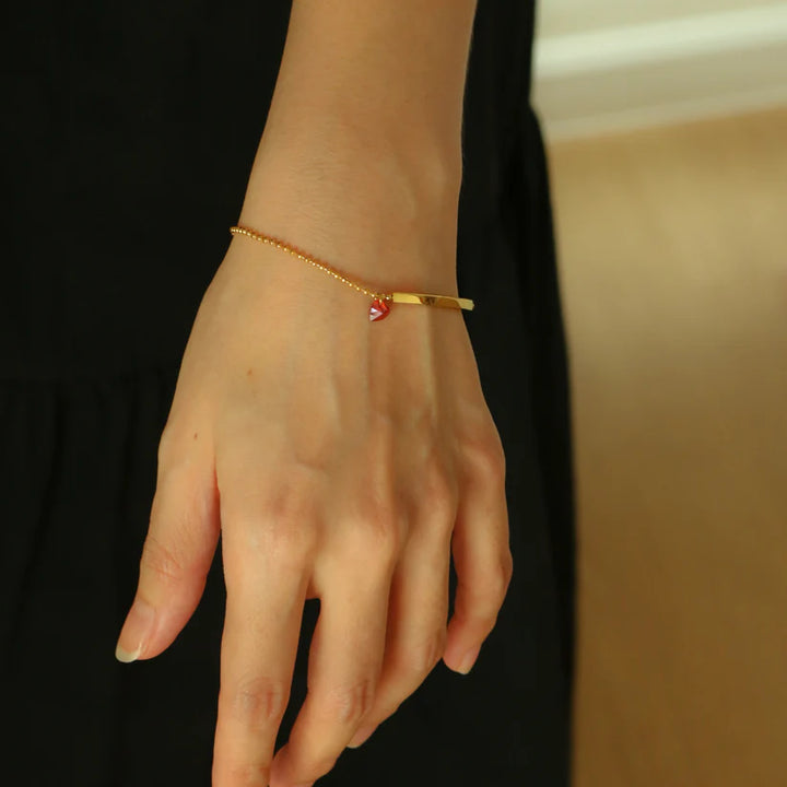 Featuring a sleek 18K gold plated bar and a charming red heart accent, this bracelet is your daily reminder of connection, care, and beauty.