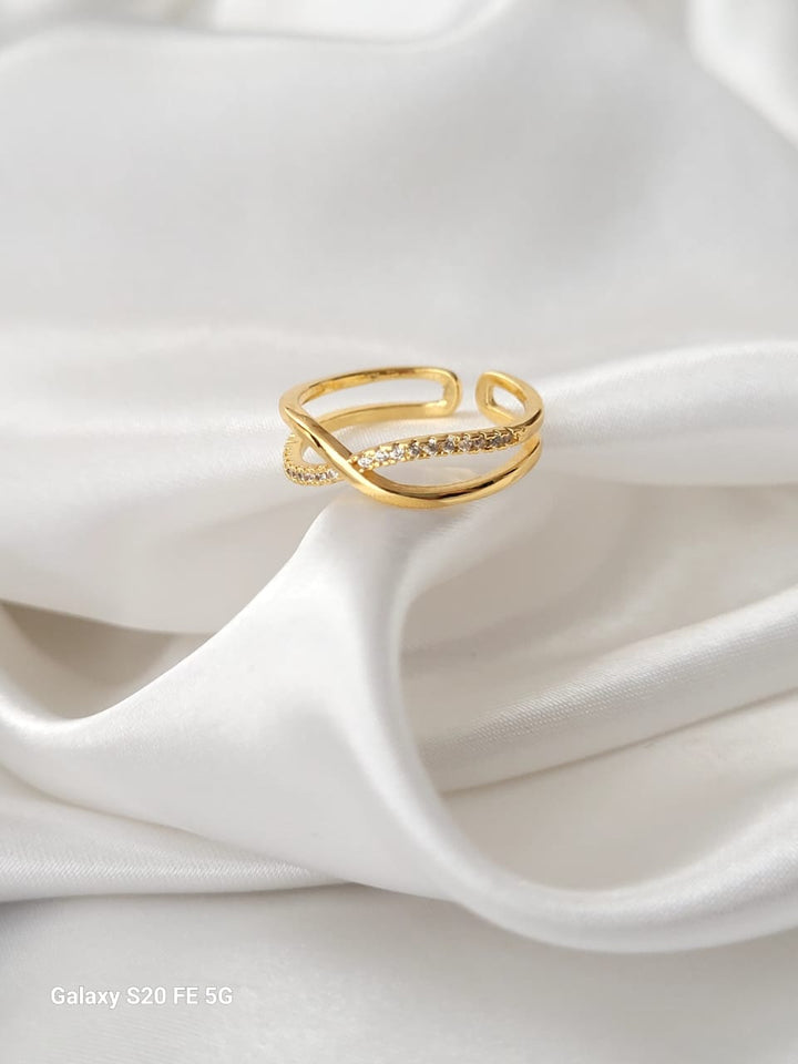 Elevate your ring stack with our Luna Crossover Ring, a stunning fusion of elegance and modern design. Crafted from stainless steel and dipped in rich 18K gold plating, this ring features a graceful crossover silhouette with one band adorned in sparkling CZ stones. It's anti-tarnish, waterproof, and hypoallergenic, making it perfect for everyday luxury that lasts.