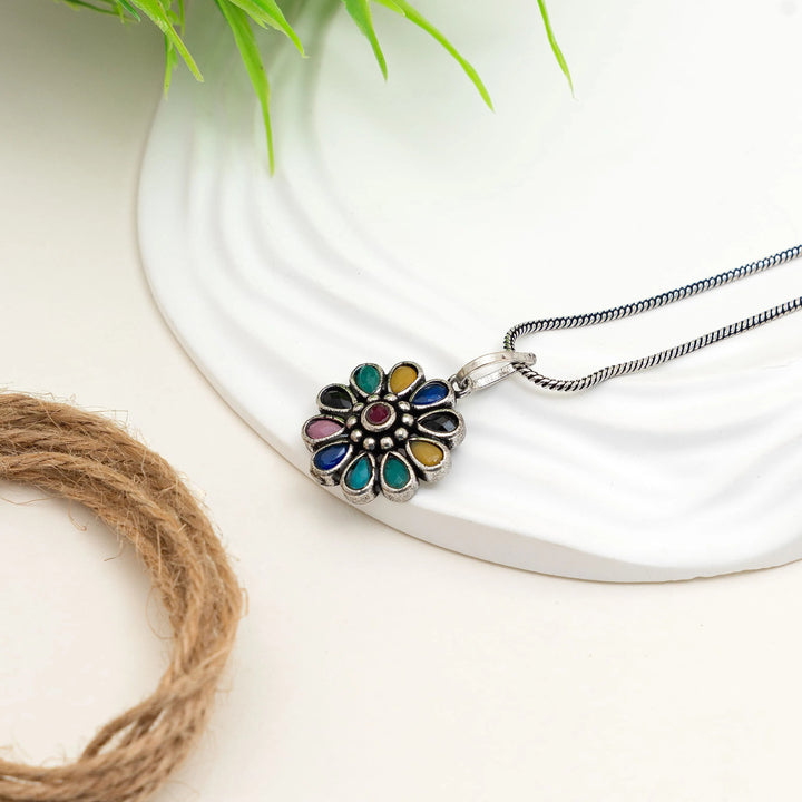Add a touch of vibrant charm to your everyday style with the Meera Multicolor Oxidised Set — a beautifully crafted pendant necklace paired with matching earrings. Designed in a floral motif, each petal is highlighted with multicolored enamel stones, giving a playful yet elegant ethnic aesthetic.