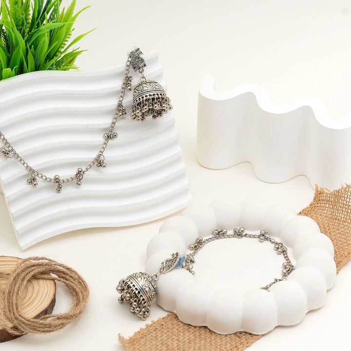 These oxidised statement earrings feature a delicate chain drop design finished with a beautifully crafted jhumka at the end — giving every move a graceful sway. The intricate detailing and ghungroo-style beads add a charming touch of traditional elegance.