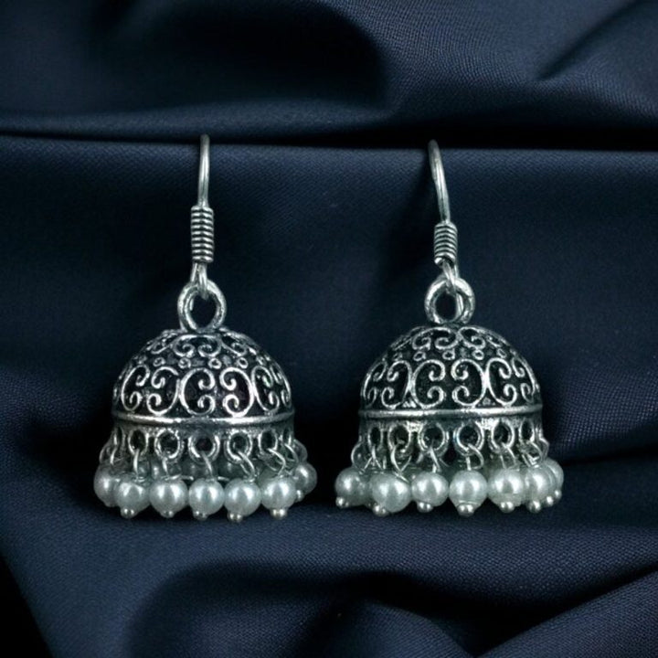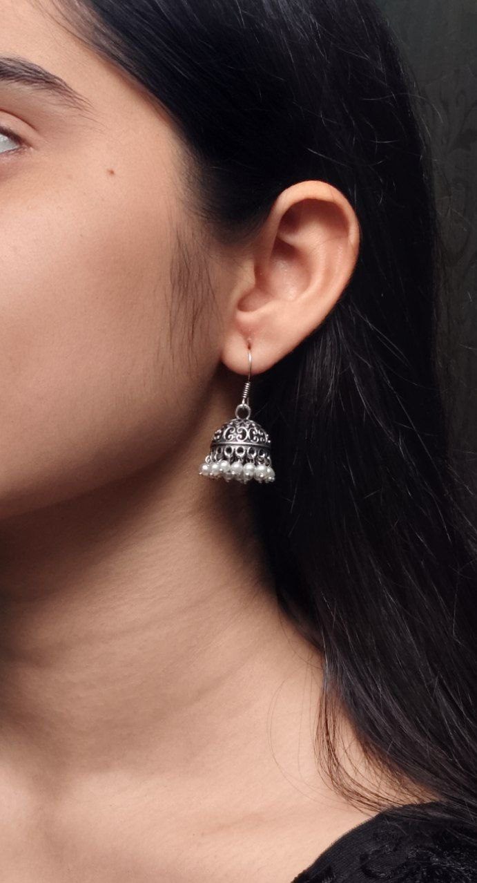 Elevate your everyday elegance with our Pearl Swirl German Silver Jhumki Earrings – a graceful blend of intricate design and traditional charm. Crafted in premium German silver and polished with a radiant silver finish, these hook-style jhumkis feature a dome-shaped pattern with delicate swirl engravings, adding a touch of timeless beauty to your ethnic look.