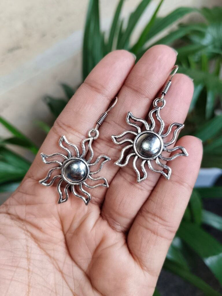 Radiate confidence with our Solar Shine Earrings, inspired by the brilliance of the sun. Crafted in an oxidized silver finish, these earrings feature a striking sun motif with bold rays that add a touch of statement style to any outfit. Lightweight and versatile, they are perfect for casual wear, boho looks, or adding an ethnic twist to your everyday fashion.