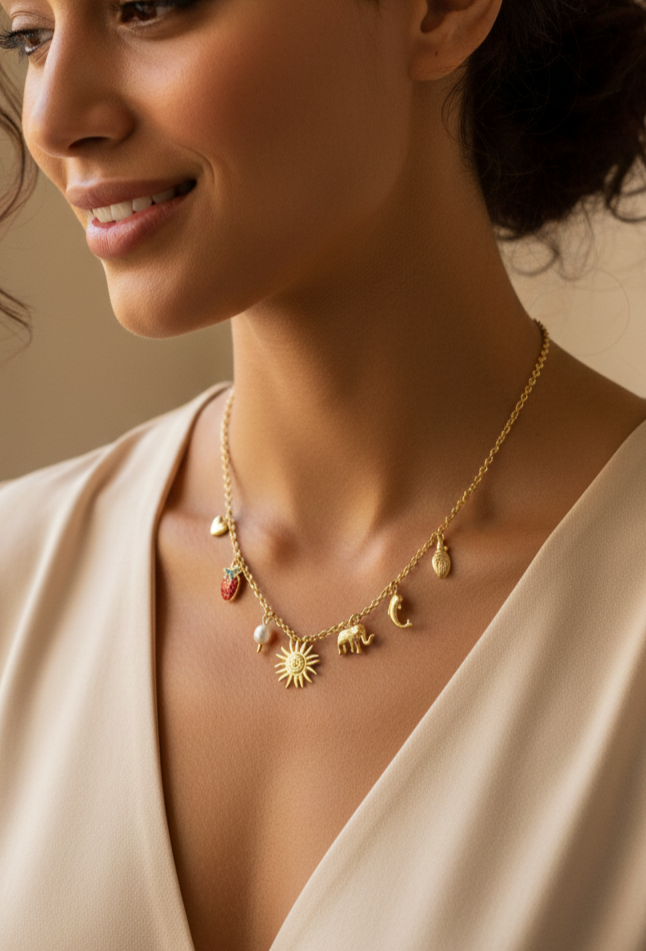 Playful, vibrant, and full of personality — the Sunlit Charms Necklace is made for those who love wearing little pieces of joy around their neck. Each charm tells a story: a heart for love, a strawberry for sweetness, a pearl for elegance, an elephant for luck, the sun for positivity, and so much more.