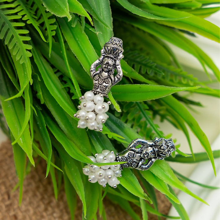 Celebrate timeless Indian craftsmanship with our Tribal Belle Pearl Oxidised Earrings. Featuring a beautifully carved tribal woman figurine holding a traditional pot, this design reflects heritage and storytelling through jewellery.
