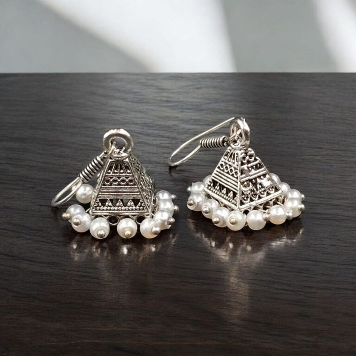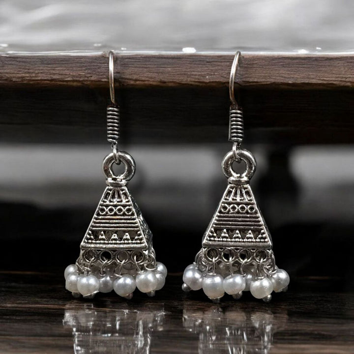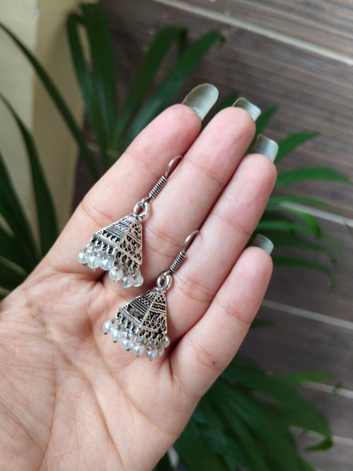 Tribal Charm Jhumka – Embrace timeless tradition with these oxidized silver jhumkas, beautifully detailed with intricate tribal patterns. Adorned with delicate pearl drops, they bring the perfect blend of ethnic grace and everyday charm. Lightweight and versatile, these jhumkas are perfect to pair with kurtis, sarees, or even fusion outfits for an elegant desi touch.