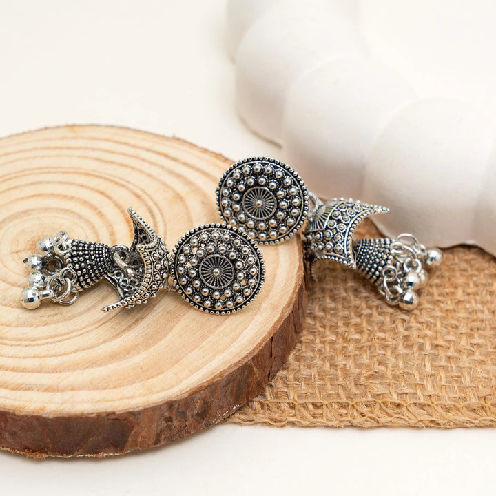 A perfect blend of traditional artistry and boho elegance — these Vintage Mandala Oxidised Dome Jhumka Earrings feature a finely carved mandala stud paired with intricately designed dome-shaped jhumkas. The oxidised silver finish gives them a rich antique look, making them ideal for festive, ethnic, and everyday styling.
